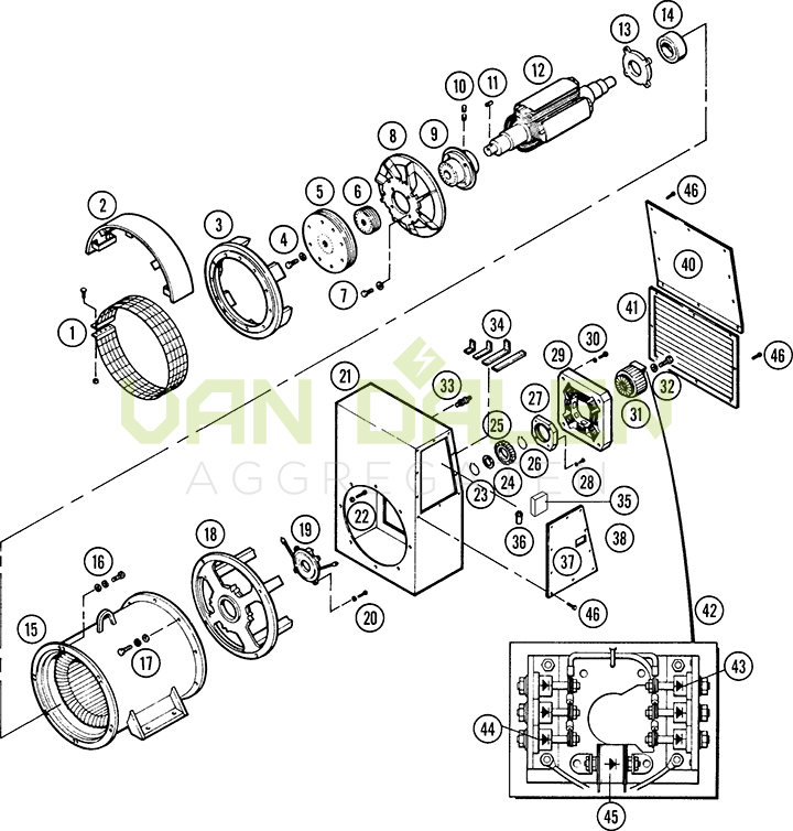 Bestel bij Van Dalen Aggregaten (vervangende) onderdelen voor uw generator. Aan de hand van de tekening en de corresponderende nummers kunt u precies zien welk onderdeel u nodig heeft.