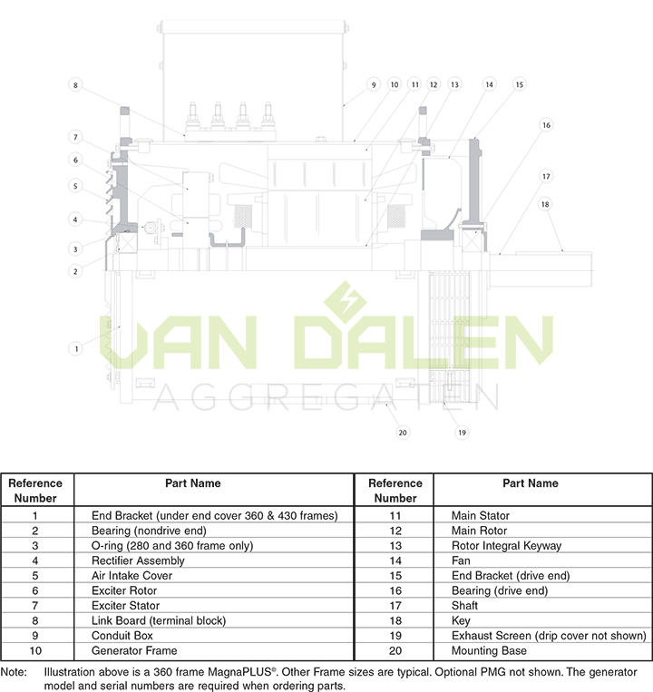 Bestel bij Van Dalen Aggregaten (vervangende) onderdelen voor uw generator. Aan de hand van de tekening en de corresponderende nummers kunt u precies zien welk onderdeel u nodig heeft.