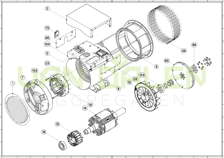 Bestel bij Van Dalen Aggregaten (vervangende) onderdelen voor uw generator. Aan de hand van de tekening en de corresponderende nummers kunt u precies zien welk onderdeel u nodig heeft.
